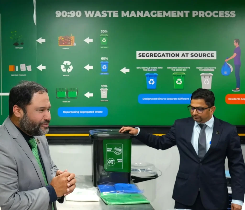 Fakhruddin Properties’ proprietary 90:90 Waste Management Initiative is a cornerstone of the real estate developer’s comprehensive sustainability strategy. It aligns directly with the UAE’s Net Zero 2050 agenda, Dubai Municipality’s plan to close landfills by 2027, and the Circular Economy Policy 2021–2031. The initiative aims to significantly reduce waste sent to landfills by promoting robust segregation for wet, dry, e-waste, recyclable items, etc.